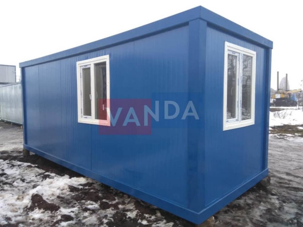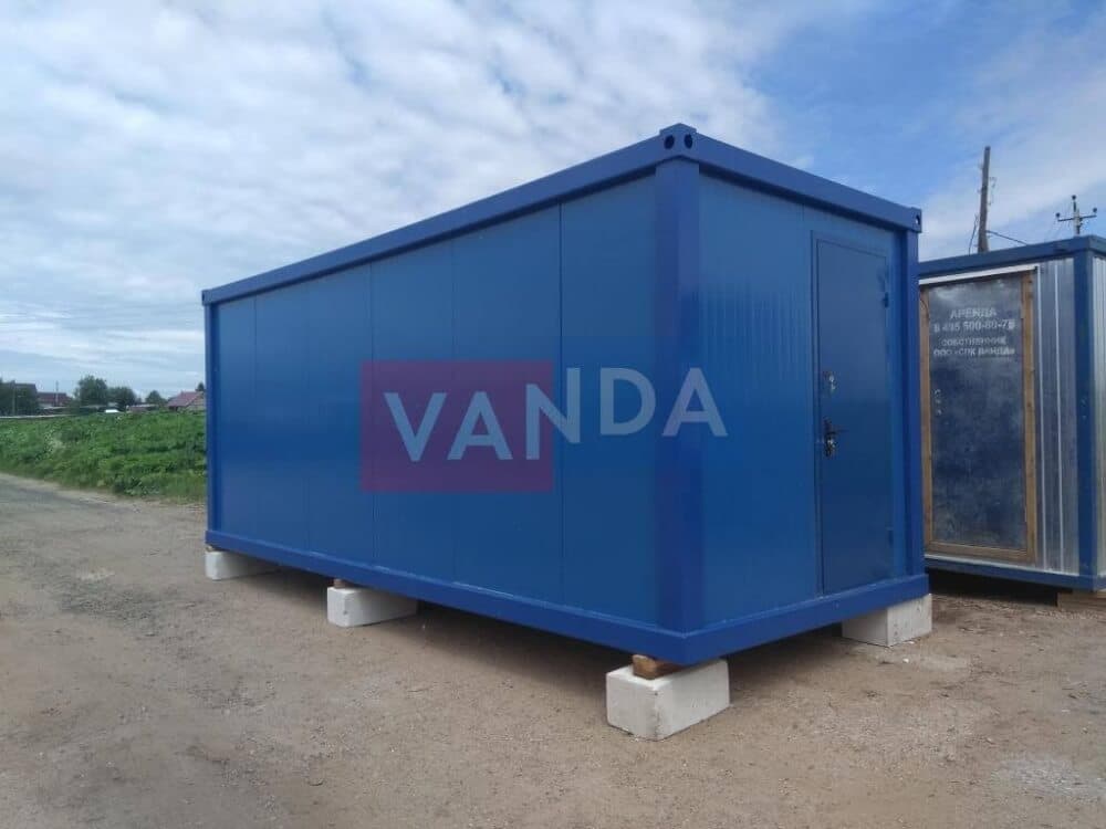 Данный контейнер не требует обустройства тяжеловесного фундамента, поскольку постройка легкая и устойчивая. Данный блок-контейнер может быть выполнен абсолютно любого размера и формы по эскизу заказчика.Контейнер состоит из металлического сварного основания. Стены изготовлены из сэндвич-панелей с прокладкой утеплителя. Крыша покрыта крашенным холоднокатаным металлом 1,2 мм. Помещение обустроено пароизоляцией при помощи технической пленки, которая проложена на полу и потолке. Внутренняя облицовка потолка выполнена из ПВХ-панелей, пол – из шпунтованной доски. Вход в помещение оборудован запирающейся металлической дверью.